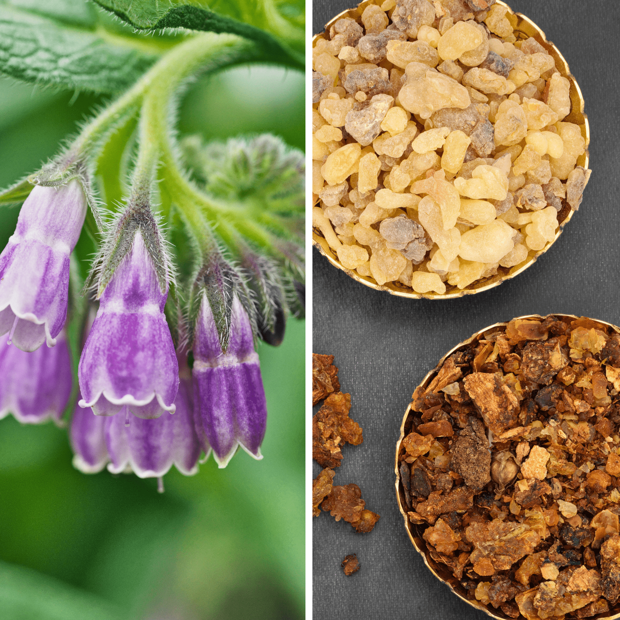 Comfrey supports vein strength and resilience, while Myrrh and Frankincense calm irritation.